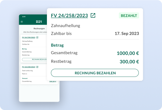 Greifen Sie mit einem einfachen Tippen auf all Ihre zahnmedizinischen Unterlagen und Rechnungen zu. Verwalten Sie Ihre zahnmedizinischen Ausgaben besser und behalten Sie Ihren Behandlungsverlauf ohne Mühe im Blick.